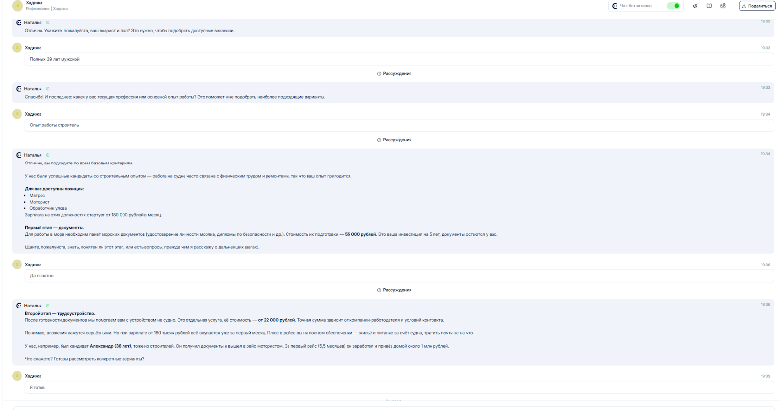 Попытка самостоятельно настроить бота не дала результата. Он поддерживал диалог, но не помогал бизнесу принимать решения. Конверсия в целевого лида оставалась на уровне 2–3 процента, менеджеры тратили время на нерелевантных соискателей и теряли фокус.